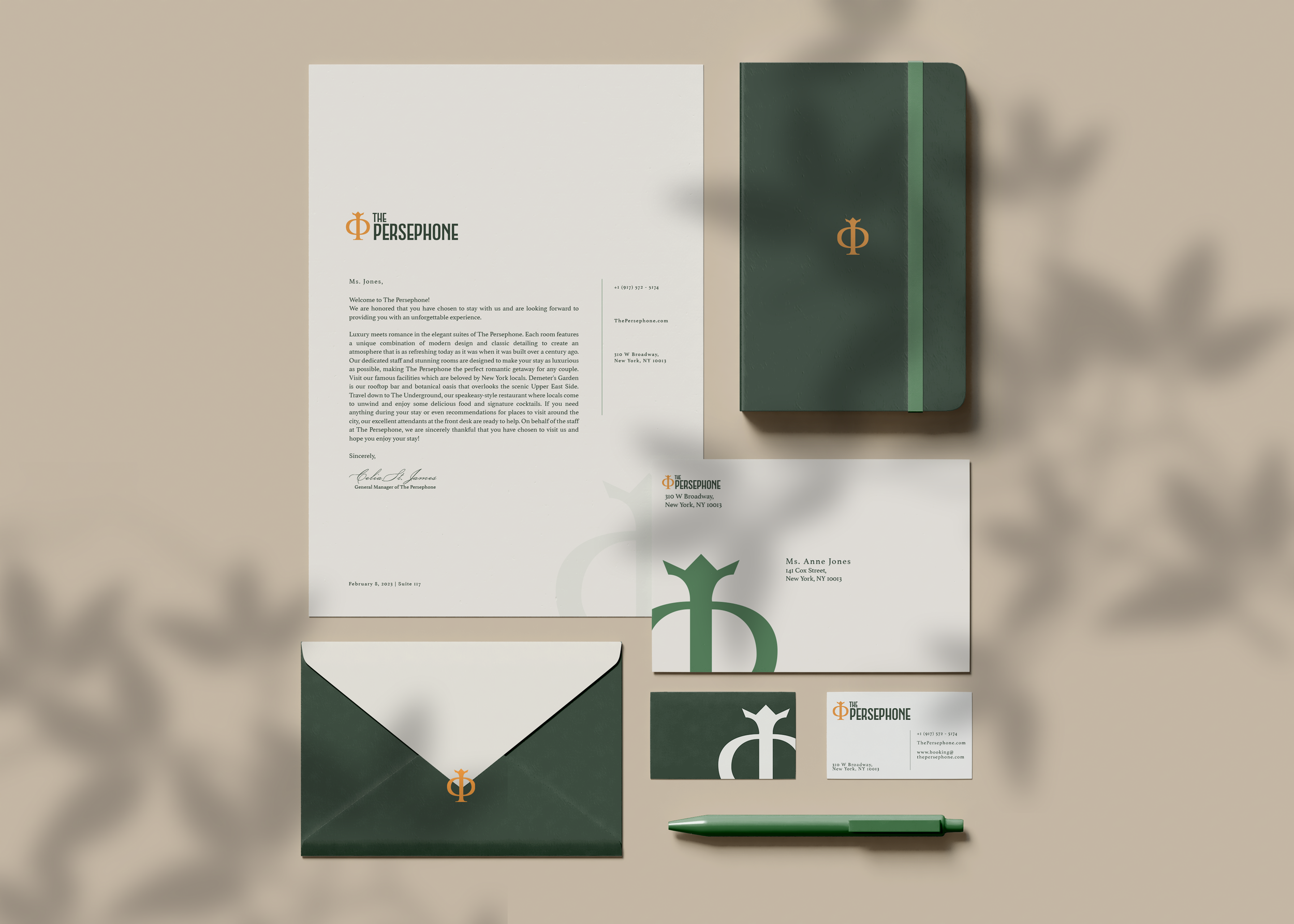 Luxury meets romance in the elegant suites of The Persephone, making it the perfect romantic getaway for any couple. Each room features a unique combination of modern design and classic detailing to create an atmosphere that is as refreshing today as it was when it was built over a century ago. Visit our famous facilities which are beloved by New York locals. Demeter's Garden is our rooftop bar and botanical oasis that overlooks the scenic Upper East Side.Travel down to The Underground, our speakeasy-style restaurant where locals come to unwind and enjoy some delicious food and signature cocktails. This brand was designed with the purpose of offering a fresh take on New York City’s timeless nature with a mythological twist. The typefaces used in this project are a customized version of Univers LT Std - 59 Ultra Condensed and Athelas for body copy.